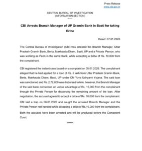 केंद्रीय अन्वेषण ब्यूरो (सीबीआई) ने उत्तर प्रदेश के बस्ती जिले में भ्रष्टाचार के खिलाफ बड़ी कार्रवाई करते हुए उत्तर प्रदेश ग्रामीण बैंक के एक शाखा प्रबंधक और एक चपरासी को 10,000 रुपये की रिश्वत लेते हुए रंगे हाथों गिरफ्तार किया है।