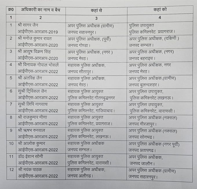 IPS अधिकारियों में सागर जैन को सहारनपुर से प्रयागराज में पुलिस उपायुक्त, मनोज कुमार रावत को गोंडा से संभल में एएसपी दक्षिणी, आयुष विक्रम सिंह को मेरठ से बहराइच में एएसपी सिटी।